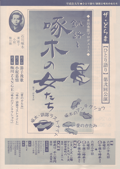 『釧路と啄木の女たち』(6月30日昼・ジス・イズ2階 ART SPACE)4月の旗揚げ公演ではシェイクスピアが取り上げられましたが、今回は釧路ゆかりの歌人・詩人である石川啄木がテーマ。啄木の妻・節子、釧路の芸妓・小奴、同じく釧路で看護婦を務めていた梅川操という、啄木に関わった3人の女性たちを、異なる3人の女優が一人語るというスタイルです。劇団のように大がかりな人数や舞台セットを必要としない一人語りらしく、小さな空間での公演でした。